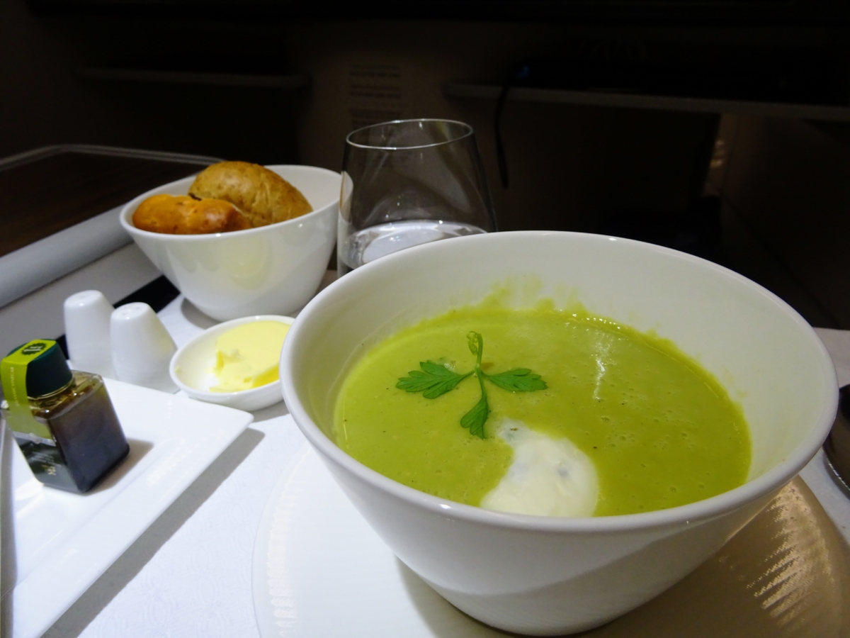 - v biznis triede sa nepoužívajú klasické vozíky a letušky nič netlačia – všetko jedlo a pitie donesú každému zvlášť na keramických tanieroch a v sklenených pohároch