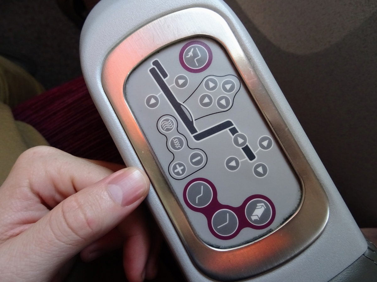 Biznis sedačky sú mega super a mohol som si ju zložiť do úplne rovnej postele. Po mojej pravej ruke sa nachádzal ovládací automat, kde som stlačil gombík podľa toho, do akej polohy som chcel sedadlo nastaviť. Najviac ma dostali masážne programy, ktoré ma pri vysokej intenzite trochu šteklili.