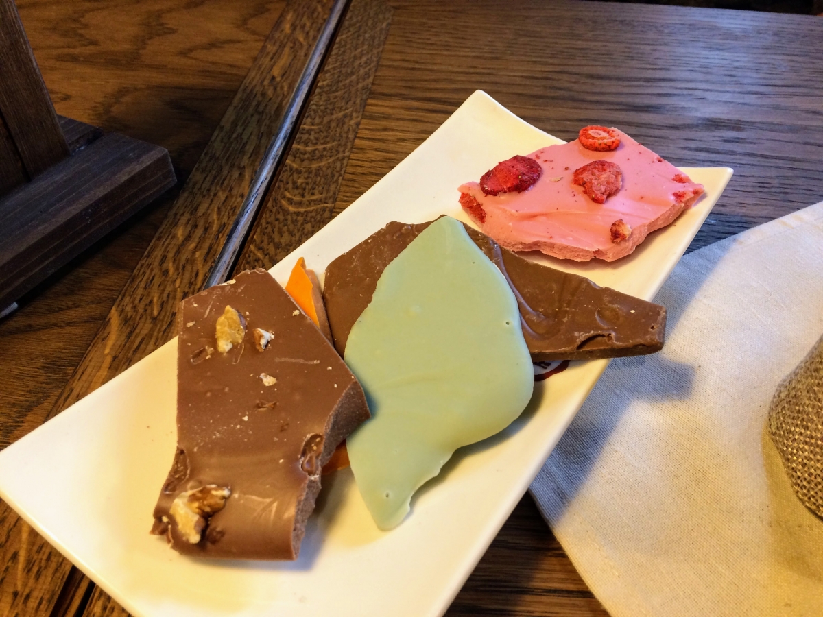 Súčasťou destilérie je aj novootvorená čokoládovňa s viacerými druhmi čokolády. V rámci ochutnávky som ochutnal čokolády rôznych farieb, no najviac ma zaujala zelená. Pralinky (konkrétne druhy čekni tu), nugátový a champanský krém, sladké medianty a tekutá čokoláda. Vedel by som tu presedieť zvyšok života!
